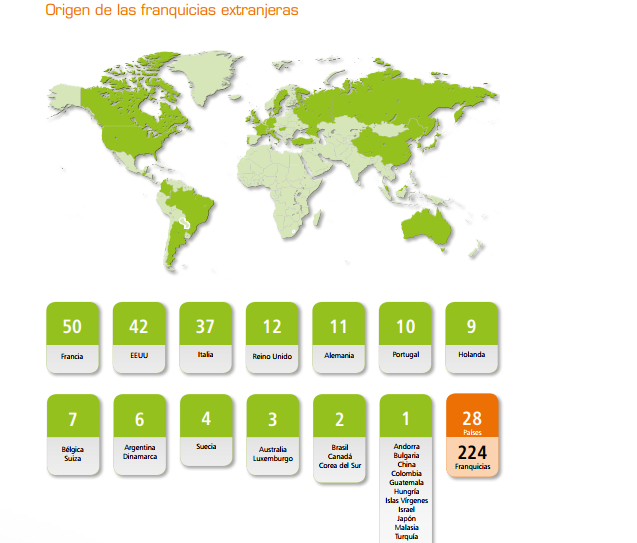 Una de las secciones que más nos ha gustado sobre este estudio es conocer de dónde vienen las franquicias, y este mapa, nos deja muy claro que Francia es el rey de las franquicias seguido muy de cerca como no podía ser de otra forma EEUU. Mientras que China, cierra la lista como uno de los países más pobres en franquicias.